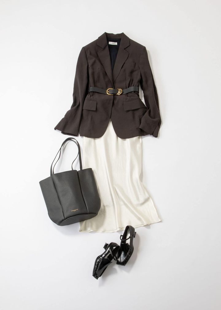 甘さ控えめのブラウスをINしてジャケットを羽織れば、程よくきちんとしたオフィス仕様に。バッグとシューズはキャメルでまとめて、全体を明るく柔らかな印象に仕上げて。