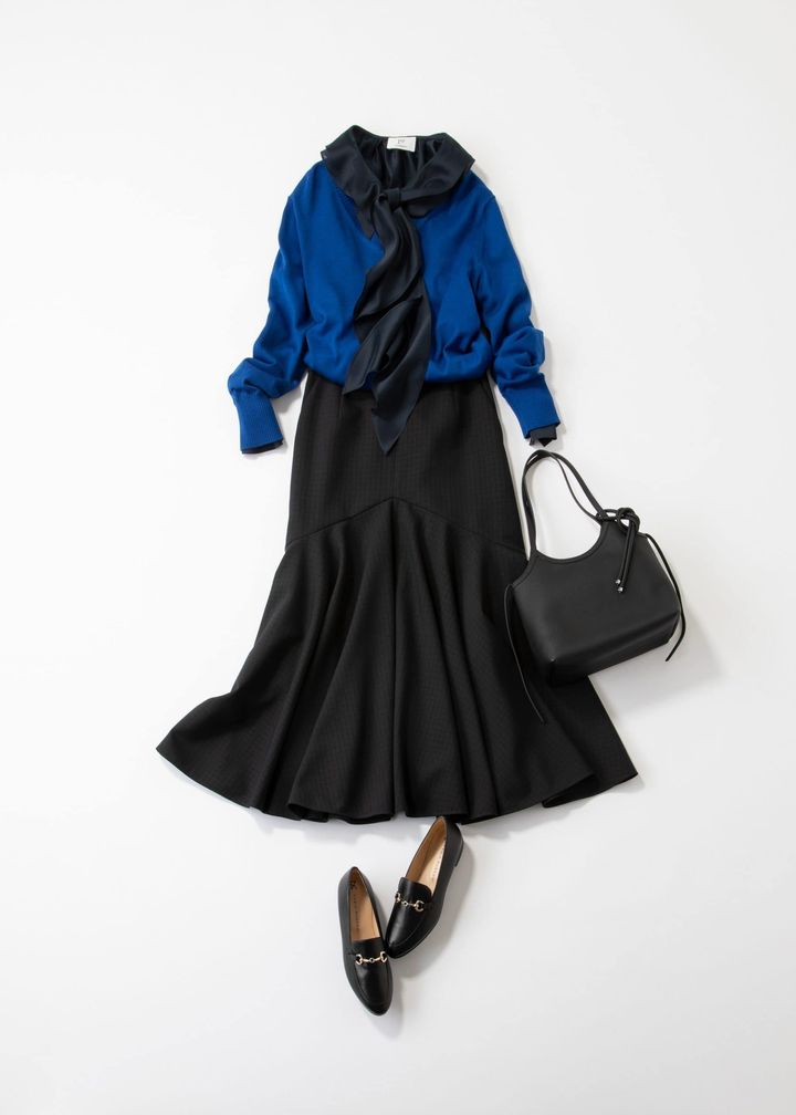 ニット¥18,700(アンタイトル) ブラウス¥24,200(プルミエ アロンディスモン/プルミエ アロンディスモン NEWoMan新宿) スカート¥66,000(オブリオ) バッグ¥40,700(ヴァジック/ヴァジックジャパン) ローファー¥34,100(ファビオ ルスコーニ/伊勢丹新宿本店 本館2階 婦人靴)