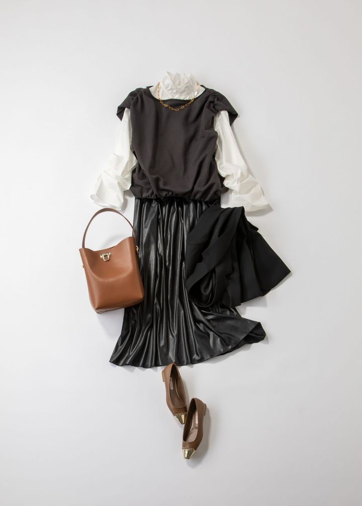 さらに、黒でも重く見えないツヤ素材のブラウスをレイヤードして、コーデに奥行きをプラス。ボトムスは、ほぼクロ見えするネイビーのチェック柄マーメイドスカートで、シックな配色のままドラマチックにまとめて。