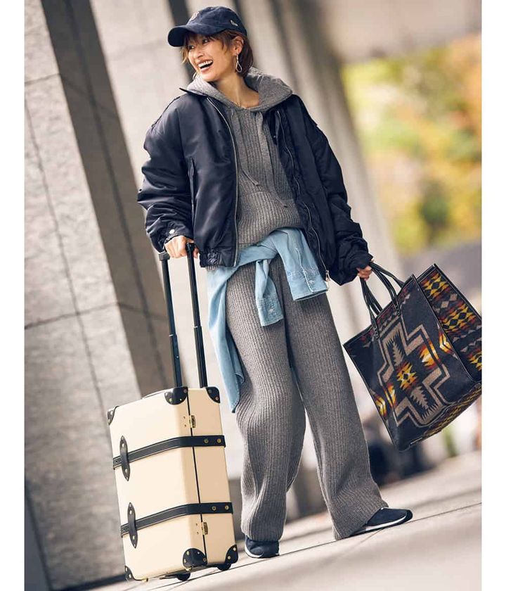 【コーデすべて】ジャケット¥39,600(プランクプロジェクト/プランクプロジェクト 青山店)ニットパーカ¥55,000パンツ¥49,500(ともにサードマガジン)腰に巻いたデニムシャツ¥19,800(カデュネ)トランク¥330,000(アドーア)バッグ¥84,700(ア ヴァケーション/ノーベルバ)スニーカー¥16,280(ニューバランス/ニューバランスジャパンお客様相談室)キャップ¥5,500(ニューエラ)ピアス¥30,800(ブランイリス/ブランイリス トーキョー)リング¥38,500(リューク)