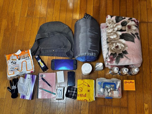 防災用品(ティッシュ、軍手、バッグ、タオル、ノート、ライト、マスク、歯ブラシ、消毒液、ビニール袋、ボールペン、ウェットティッシュ、応急処置具)、ハンカチ、スマホ、モバイルバッテリー、寝袋、毛布、汗拭きシート、娯楽用品、栄養調整食品、水