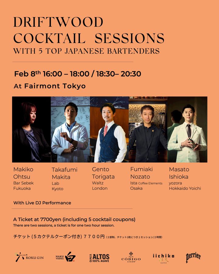 2月8日(日)に開催される1夜限りのイベント「DRIFTWOOD Cocktail Sessions」は、現在予約を受付中です。カクテルクーポン5枚が付いた事前予約は、当日券よりもお得に購入できるます。心地良いDJパフォーマンスと煌めく夜景に包まれながら展開される、新たなバー体験をお見逃しなく!