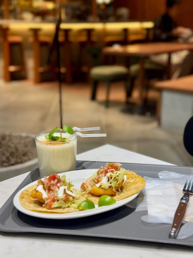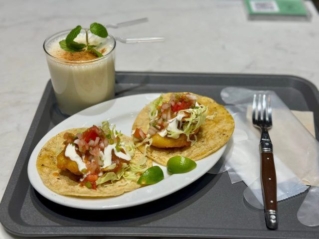 フードはバハフィッシュタコス2枚、トルティーヤのサルサ煮込み目玉焼きと一緒に、チキンとライムのスープの3種類。 まずは王道のタコスを選びました。 ドリンクはコーヒー、オレンジジュース、スムージーの3種類です。