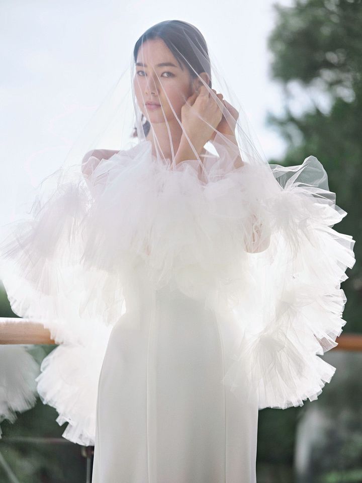 ベール¥35,200[レンタル価格](ハツコ エンドウ ウェディングス 銀座 tel.03-3563-1411) ドレス ¥330,000[レンタル価格](エー バイ ハツコ エンドウ/ハツコ エンドウ ウェディングス 銀座 tel.03-3563-1411)