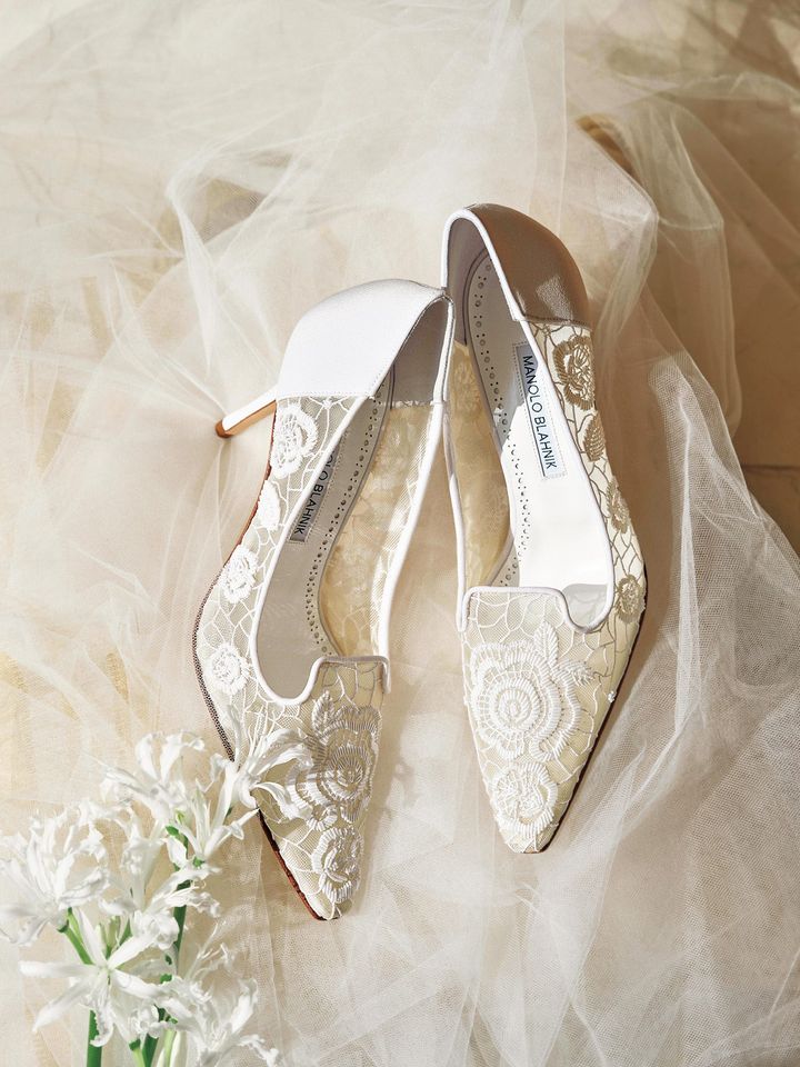 花の刺繍を施したメッシュパンプスで、足元もドレスアップ。