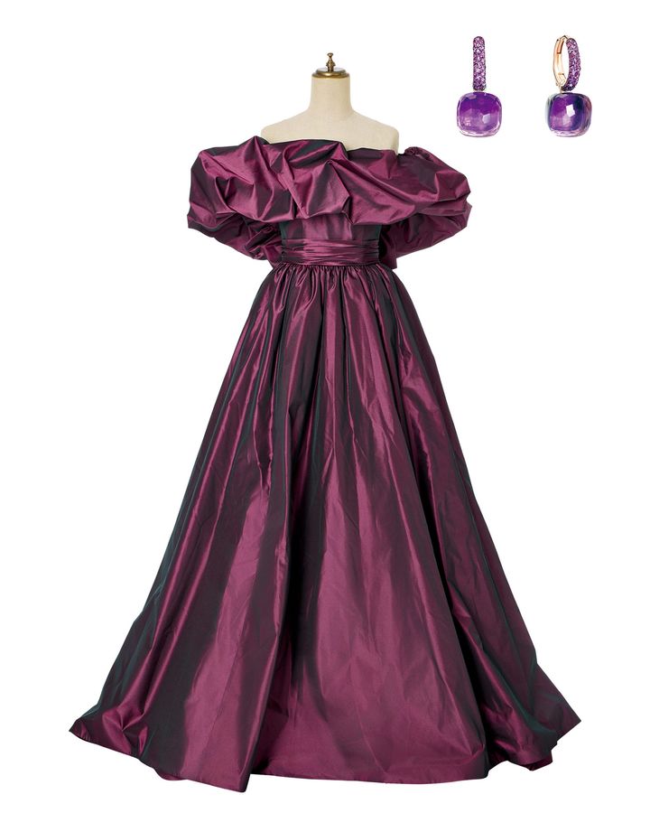 豊潤なグレープカラー。タフタの質感が映えるオフショルダードレス。