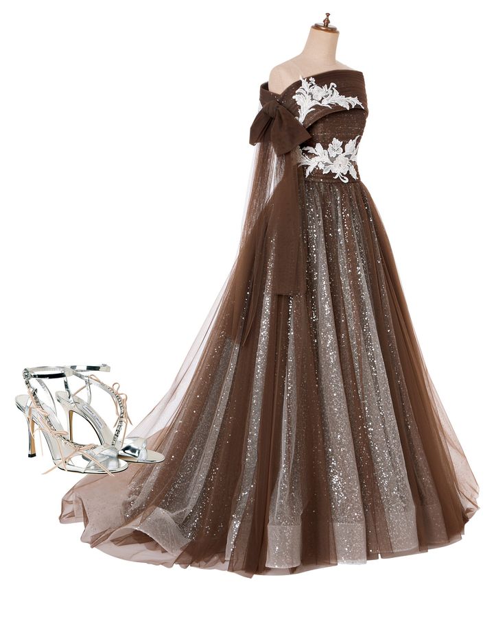 ブラウンに白の花刺繍。スパンコールにチュールを重ね、煌めきを控えめに。