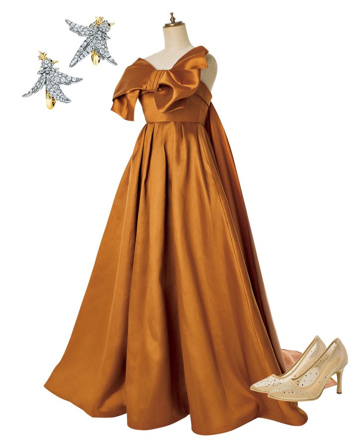ドレス¥330,000[レンタル価格](ドレスモア tel.06-6266-0069) ピアス"バード オン ア ロック by ティファニー"[Pt×YG×ダイヤモンド]¥5,170,000(ティファニー/ティファニー・アンド・カンパニー・ジャパン・インク tel.0120-488-712) 靴[H10]¥39,600(ベニル tel.078-222-0511)