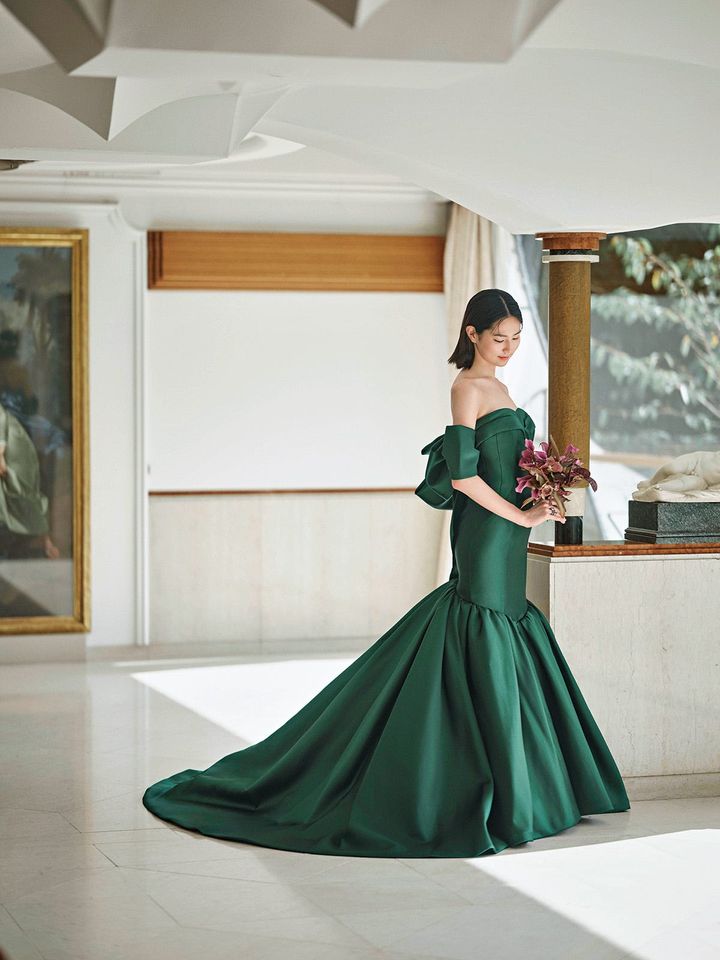 イタリア製シルクミックスサテンを使用した、マーメイドラインのドレス。取り外しできる帯のようなループ状リボンをスリーブに。新鮮なグリーンで注目を浴びて。