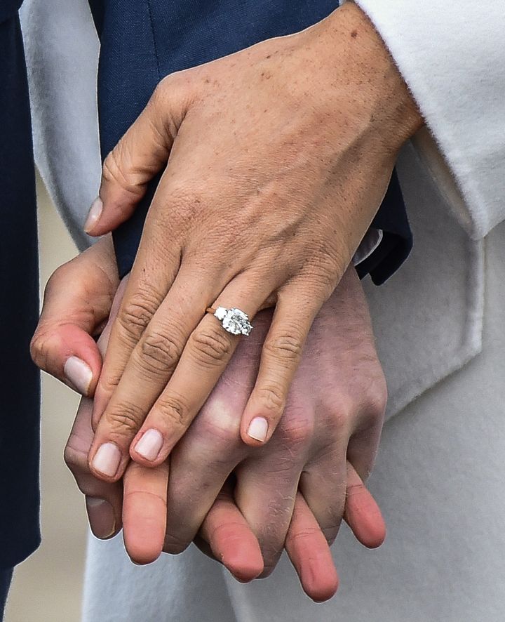 中央にボツワナ産のクッションカットダイヤモンド、両脇にはダイアナ妃のパーソナルコレクションから取られた2粒のダイヤが配された指輪についてメーガン妃は、「彼女がこの出来事を、私たちと一緒に見守ってくれていると感じられることが、私にとってとても大切」と語った。