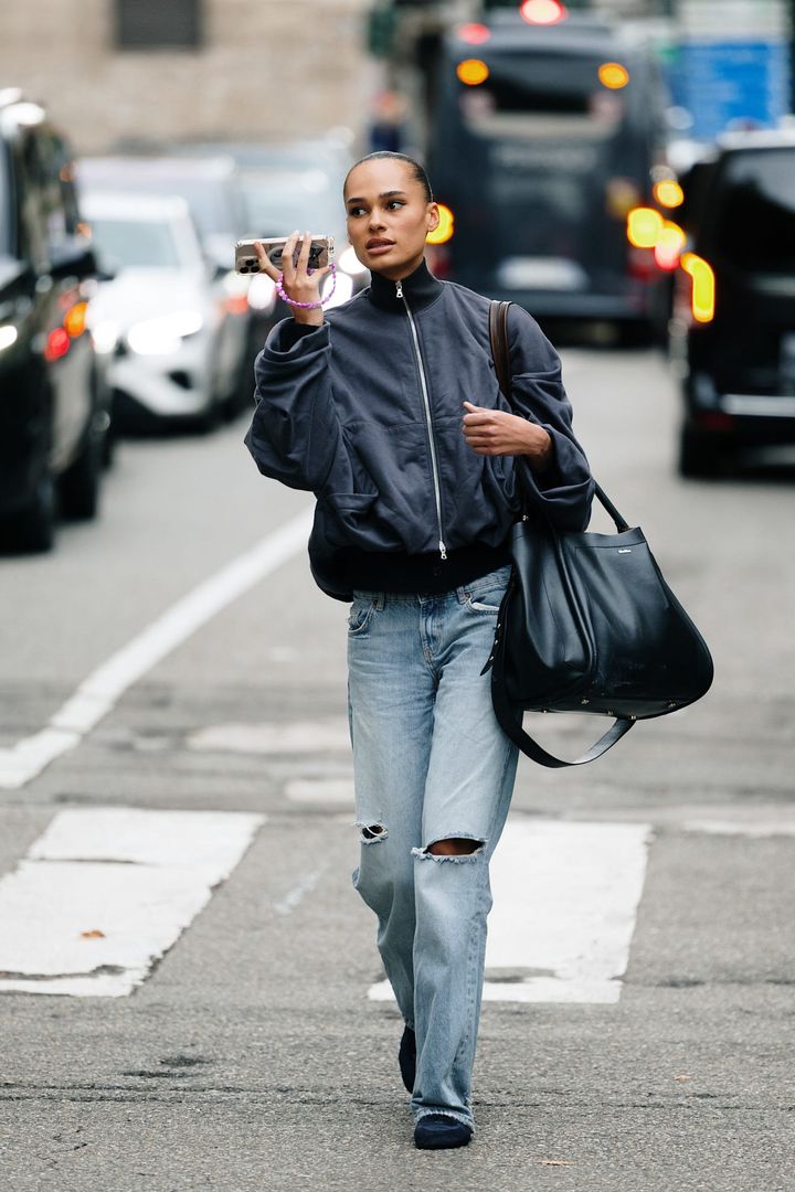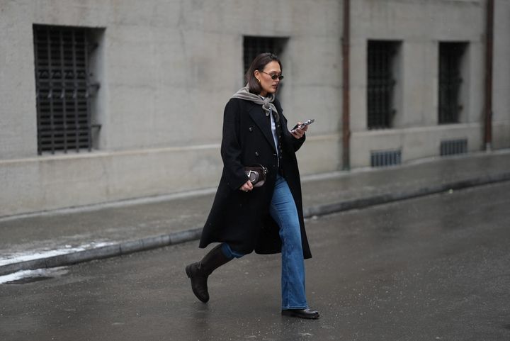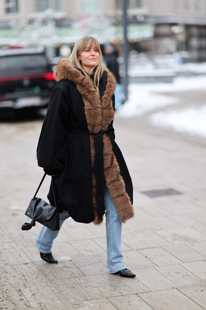 おしゃれ賢者たちもストーブパイプデニムをいち早く取り入れ、旬の着こなしを楽しんでいる。「ロテート」のディレクターでもあるジャネット・マドセンは、存在感のあるフェイクファーコートに、すっきりとしたストーブパイプデニムを合わせた。足もとはシャープなシューズで引き締め、ラフになりすぎず品のあるムードをキープ。