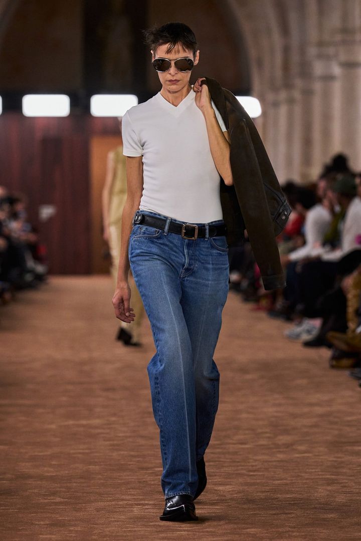 ストーブパイプデニムが次なる主役デニムとして注目を集めるきっかけとなったのは、2026春夏コレクションのランウェイ。「アクネ ストゥディオズ」では、白Tシャツにストーブパイプデニムを合わせた肩の力が抜けたミニマルルックが登場。エッジなショートブーツを合わせ、モード感のある都会的スタイルに。