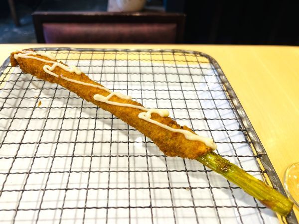 最後は、楽しみにしていたアスパラガス!上品に豚肉に巻かれた鮮やかなグリーン色のアスパラガスは、ほっこりした味わい。マヨネーズソースがアクセントになっていました。