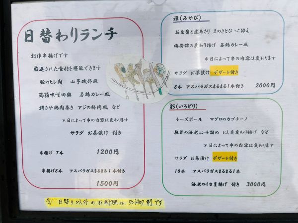 帰宅後、お店の口コミを拝見すると、みなさん創作串に熱い想いを綴られていました。日替わりランチでワクワクしたので、次回は他のコースもいただきたくなってきます。次は、アルコールを片手に!
