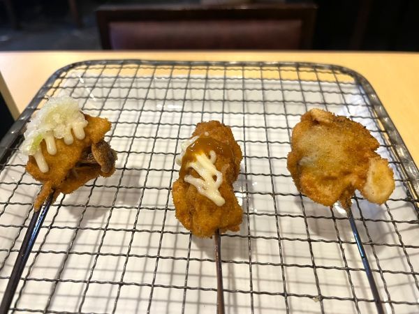 この日は「かぼちゃ・豆腐・こんにゃく・かまぼこ」。意外にも身近な食材だったので、一瞬「えっ・・・?」と思ったのですが、食べてみてビックリ! 「こんにゃく」にはねぎも挟まれていて、味噌田楽風。豆腐を包んだ鰹節の食感がたまらず、「かまぼこ」にはシソと梅が挟まれていました。 上品にカラッと揚げられた串は、一口、もしくは二口で食べられるサイズ。小さな一本の中に、創作串の魅力がぎゅっと詰まっていました。