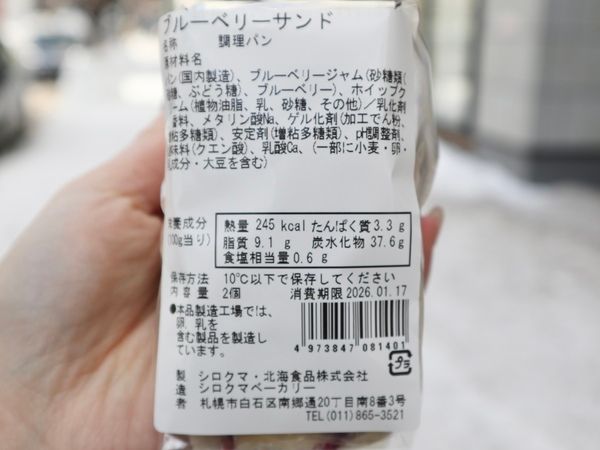 ブルーベリーサンドを購入しました。道産素材にこだわった食パンに、ブルーベリージャム&ホイップクリームがサンドされたシンプルな一品です。