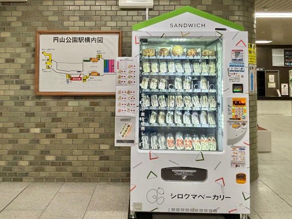 地下鉄東西線「円山公園駅」を降り改札を出てすぐ、4番出口方面に向かいます。切符売り場の横にたくさんのパン&サンドイッチが並ぶ自販機を見つけました!