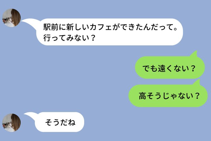 ある日、彼女から「駅前に新しいカフェができたんだって。行ってみない?」とLINEが届きました。嬉しかったのですが、場所を調べると少し遠いし、写真を見る限り値段も高そうで。思ったことをそのまま「でも遠くない?」「高そうじゃない?」と返しました。すると彼女からは「そうだね」とだけ。それきり会話は続きませんでした。いつも通りのやりとりだと思っていたのに、どこか引っかかるものが残りました。