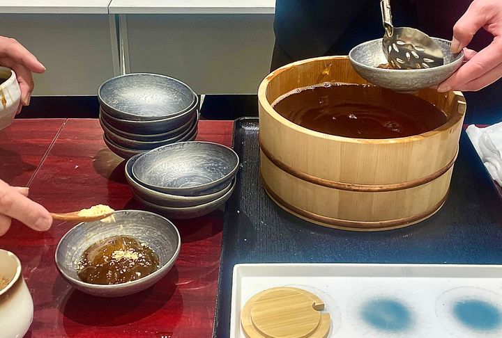 試食会で用意されたスイーツなど。添えられた出汁は旨みが濃厚で、玄米ならではの香ばしさがふわっと広がります。
