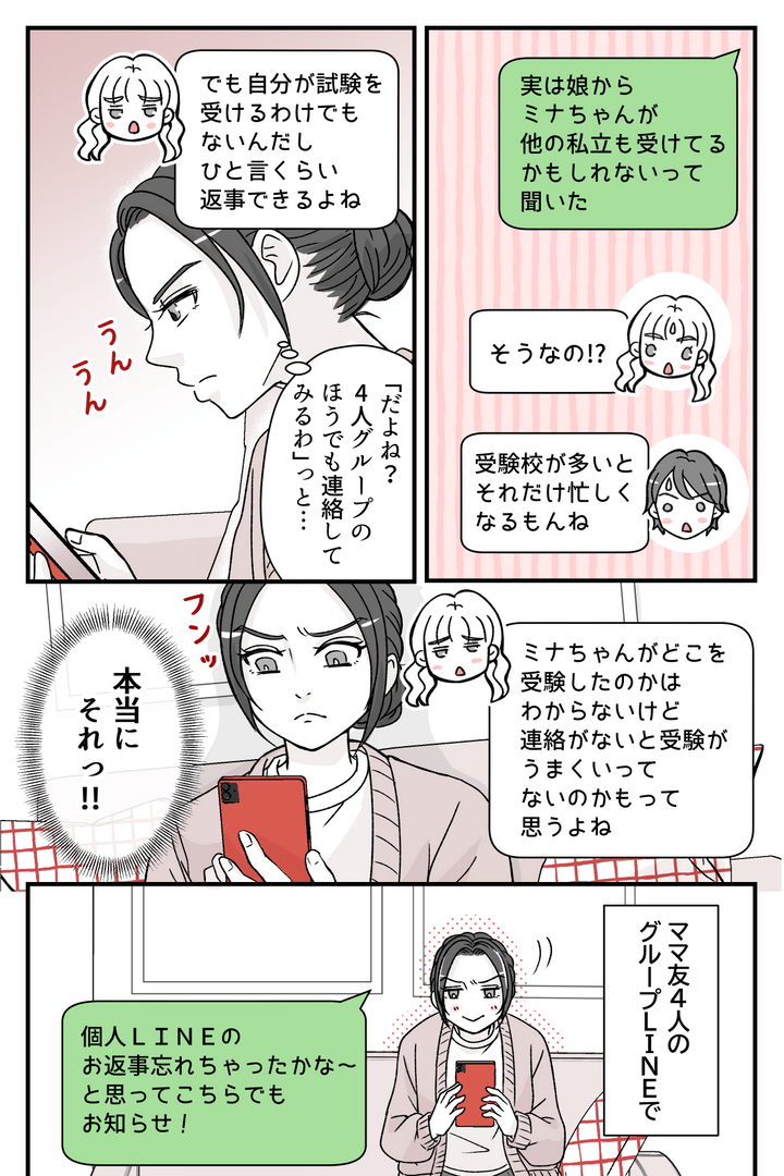 その後、ママ友4人のグループLINEでもミナママ宛てのメッセージを送ってみました。リコママ、ハルママも私のメッセージに続けて援護するような言葉を送ってくれます。するとようやくミナママから返事がきたのですが、なんと、ミナちゃんはX高を受験しないと言うのです。
