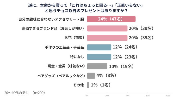 好みのズレが生じやすいものや、お返し・気遣いの負担を感じさせてしまうプレゼントは、本命であっても戸惑いに繋がりやすい傾向がうかがえます。