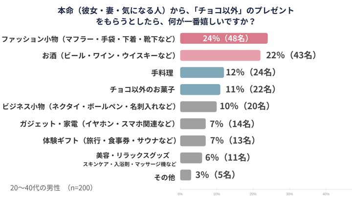 200名の男性に「本命からチョコ以外でもらって一番嬉しいもの」を調査したところ、実用性と特別感のバランスが取れたアイテムが上位に並びました。