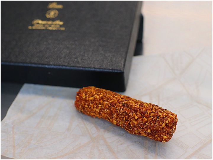 低温調理したフォアグラにクルミ、アーモンド、キャラメリゼした砂糖を、細かく砕いたものをコーティング。