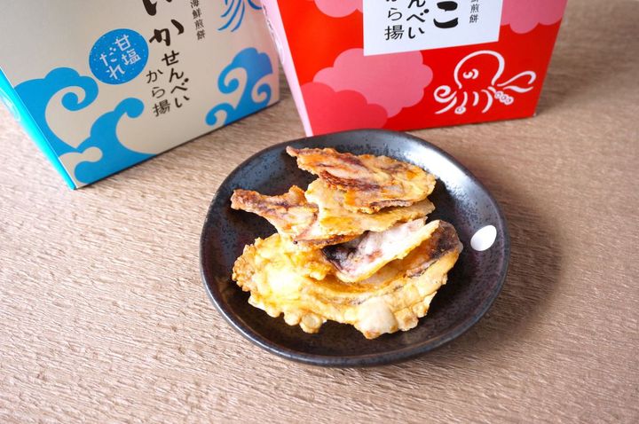 たこといかを使用し、秘伝のタレとこだわりの工程で作られた「から揚げせんべい」。一度食べたらやみつきになると評判です!