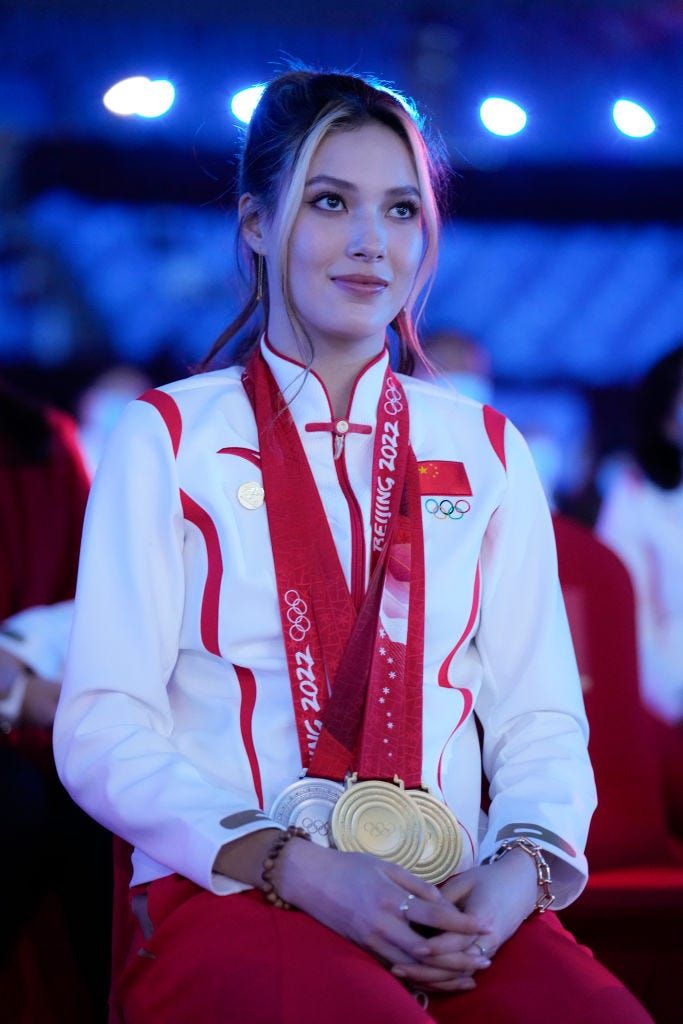2022年2月に開催された北京オリンピックには、中国の代表選手として出場。フリースタイルスキー女子ビッグエアとハーフパイプで金メダル、スロープスタイルで銀メダルを獲得し、世界にその名をとどろかせた。