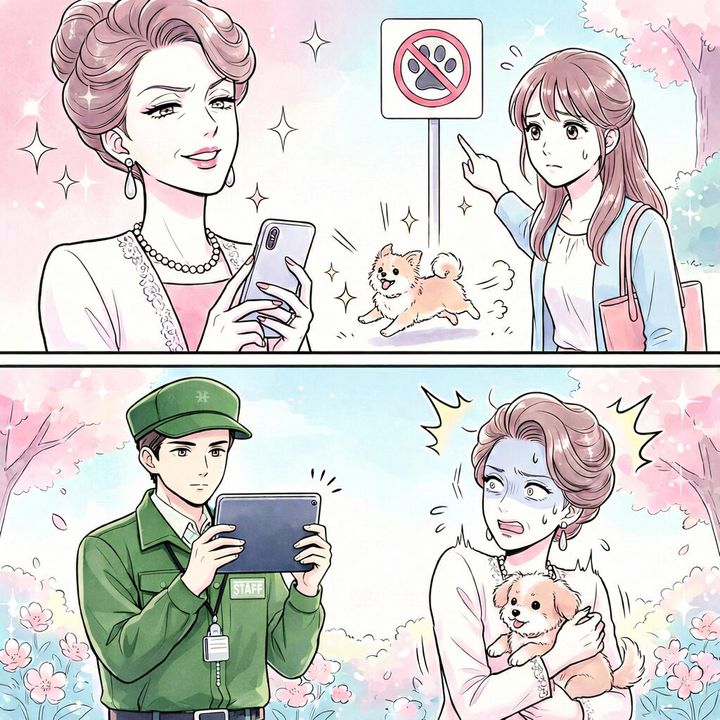 管理人の言葉を聞いて、彼女の顔からは血の気が引きました。「ごめんなさい!」と震える手で犬を抱き上げ、彼女は逃げるように去っていきました。