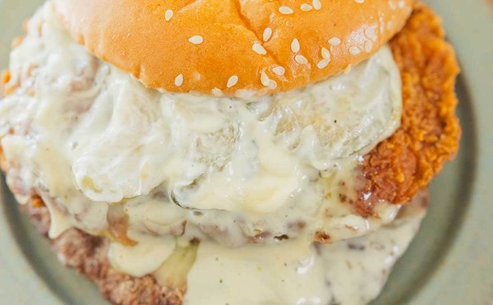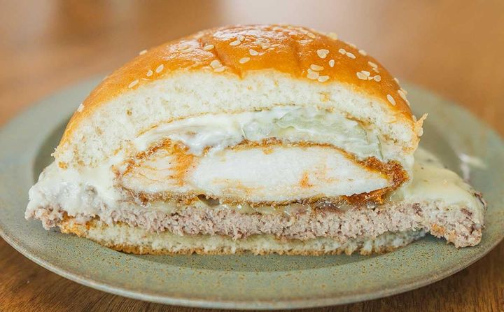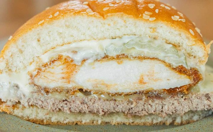 バンズのあいだには、ビーフパティとチキンパティ、ピクルス、マヨソース、ゴーダチーズスライス2枚、ホワイトチーズソースが入っています。