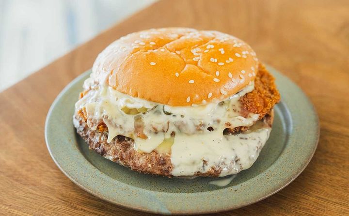 食べる前からにんにくの香りが感じられ、食欲が刺激されます。香ばしいビーフパティと、サクサクとしたジューシーなチキンパティに、にんにくのうまみがしっかりときいたホワイトチーズソースがベストマッチ! クリーミーなマヨソースやチーズのコクも◎。ピクルスのさっぱりとした風味がよいアクセントになっていますね。