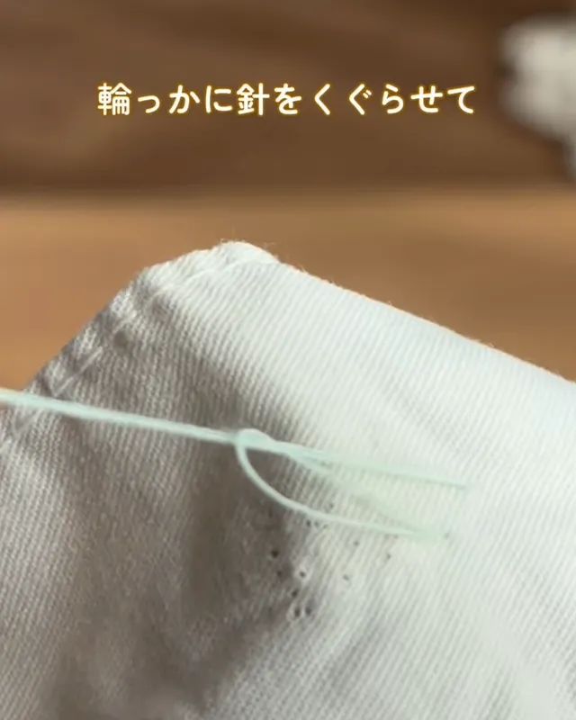 縫い終えたら、指で糸を持ち、輪っかを作りながら、ボタンに巻きつけましょう。