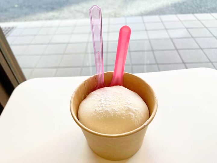 今回私は、冬季限定のジェラもち・2種盛りをいただきました。ジェラもちは、ジェラートを1種類から選ぶことができました。本日のおすすめ「いちごとホワイトチョコ」にしました。