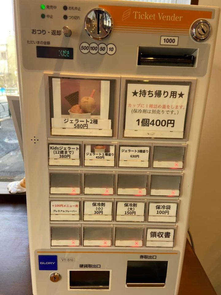 店内に入ると食券が置いてあり、食券を買ってからジェラートの味を選びます。PayPay支払いをしたい場合は、食券を買わずに店主さんに伝えれば対応してくれます。