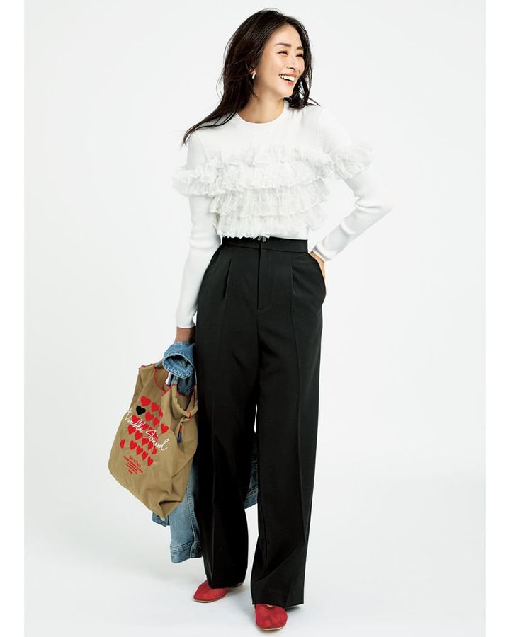 パンツ¥15,950(DAY byDAY It’s international)ニット¥16,500(マイストラーダ/マイストラーダプレスルーム)ジャケット¥26,400(アルページュストーリー/アルページュストーリー プレスルーム)バッグ¥6,050(ボールアンドチェーン×ダブルスタンダードクロージング/フィルム)シューズ¥42,900(ヒューン/クルーズ ショールーム)ピアス¥110,000(ウノアエレ/ウノアエレ ジャパン)