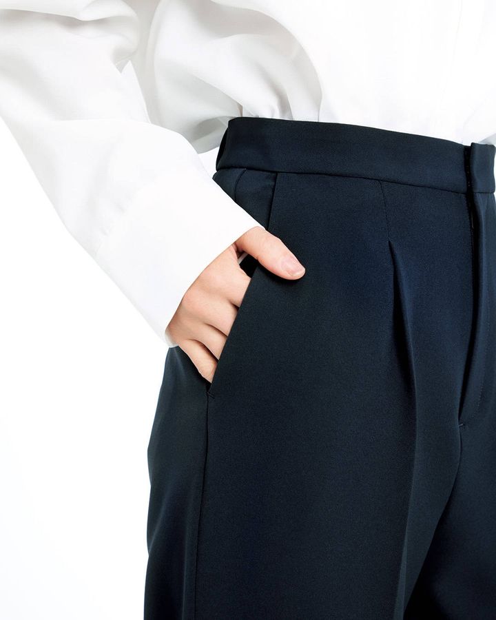 穿くだけでこなれたシルエットを作るセンタープレス入りのタックパンツ。着席・起立の多い式でも、後ろゴムでストレスなく過ごせます。太もも回りもゆったりと作っているので、日常着として取り入れやすい。