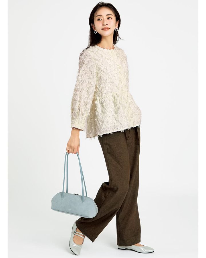 トップス¥17,930(DAYby DAY It’s international)バッグ¥18,700(アドカラム/アンソロジー)シューズ¥26,400(銀座かねまつ/銀座かねまつ6丁目本店)ピアス¥17,600(ワンエーアールバイウノアエレ/ウノアエレ ジャパン)パンツ/スタイリスト私物