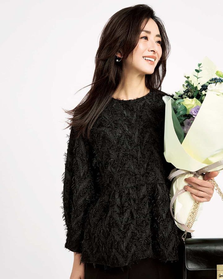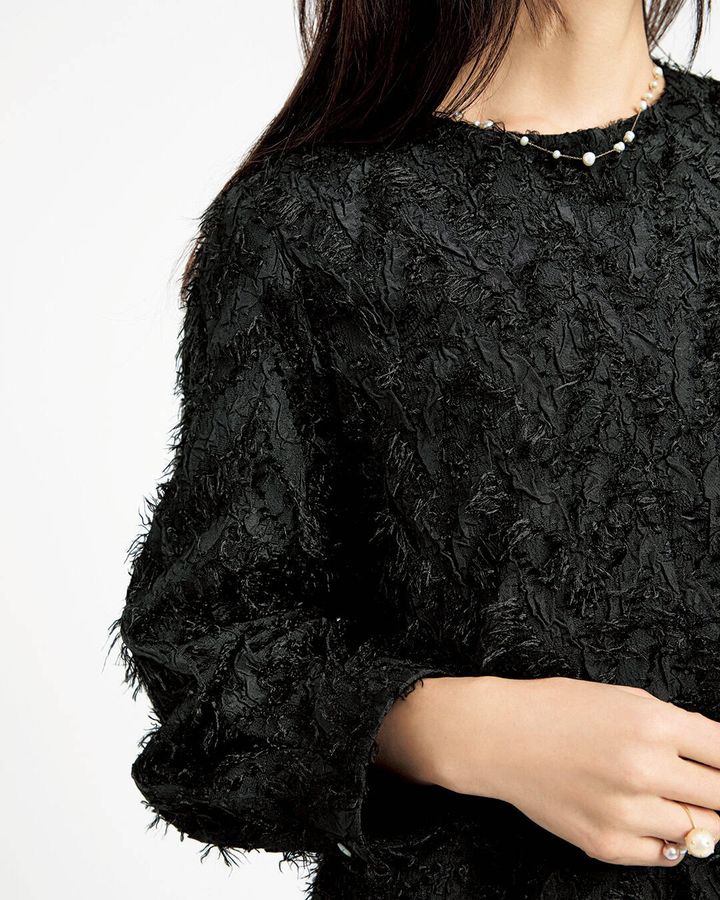 程よいペプラムと毛足の長いジャカード素材で華やかさと高級感が溢れるブラウス。フロントボタンで開閉できるので、着脱もしやすく、九分袖が洗練された印象へと導きます。自宅での洗濯も可能。