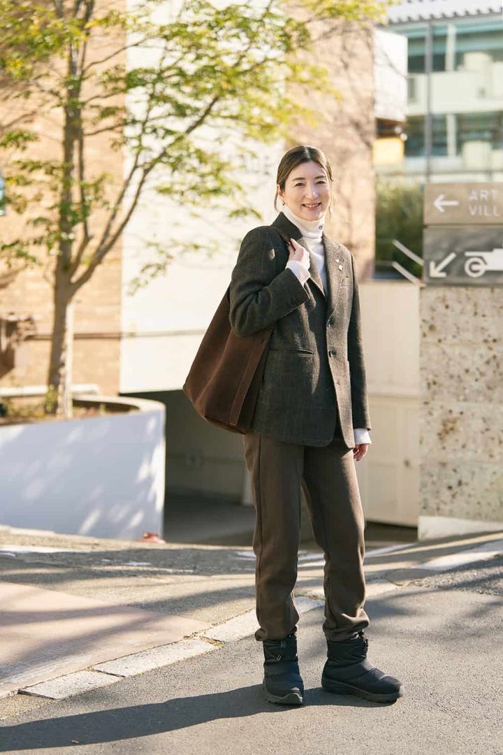 友人とのカジュアルランチやジムへ行く時に重宝しているノースフェイスのスノーシューズ。あえてカジュアルなaloのスウェットパンツを合わせて、スポーティーさを生かしたスタイリングにしました。同時にカラーはブラウンで統一し、マニッシュなテーラードジャケットを羽織ることでラフすぎないハンサムコーデに仕上げました。