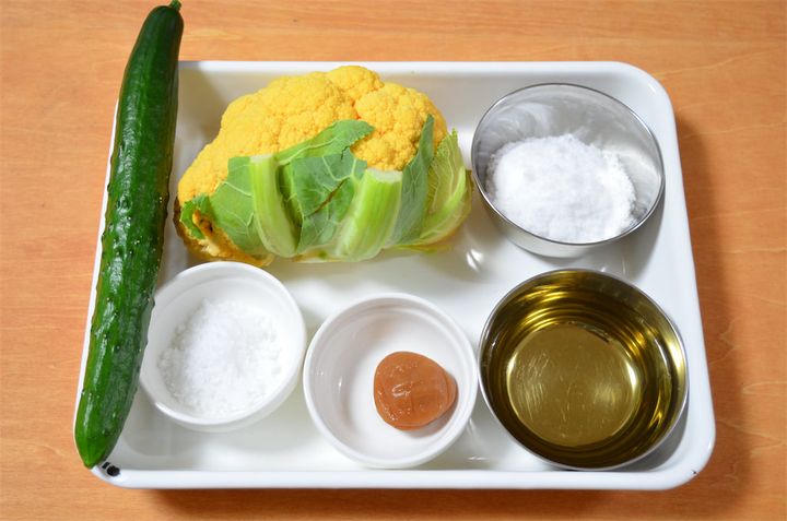 今回、福島県の農家に教わったのは「きゅうりとカリフラワーのさしす漬け」。さしす漬けって初めて聞きましたが、砂糖と塩と酢を混ぜ、そこに梅干しを漬けた漬物液だそう。なるほど、頭文字を取って「さしす」なんですね。ピクルスみたいですが、梅干しを入れるから和風ピクルスって感じかしら?加熱して冷ましたりせず、すぐ漬けられるそうなので簡単そう♪よーし、さっそく家にあったきゅうりとカリフラワーで試してみようっと!