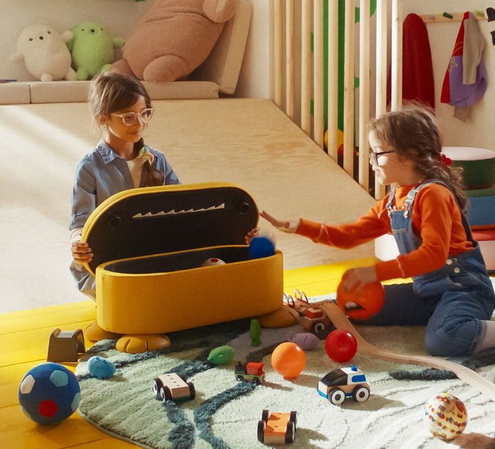 足と歯がついた、おもちゃを“食べてくれる”モンスターのような収納プーフ。座れて、しまえて、見た目も楽しい。足を内向きに付け替えれば、落ち着いたデザインになる大人にとっても納得のアイテム 。