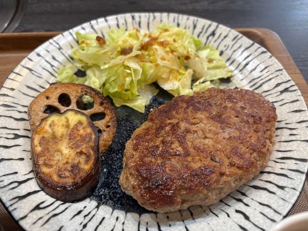 付け合わせには、ナス・しいたけ・蓮根。野菜がしっかり添えられているのも嬉しいポイントです。