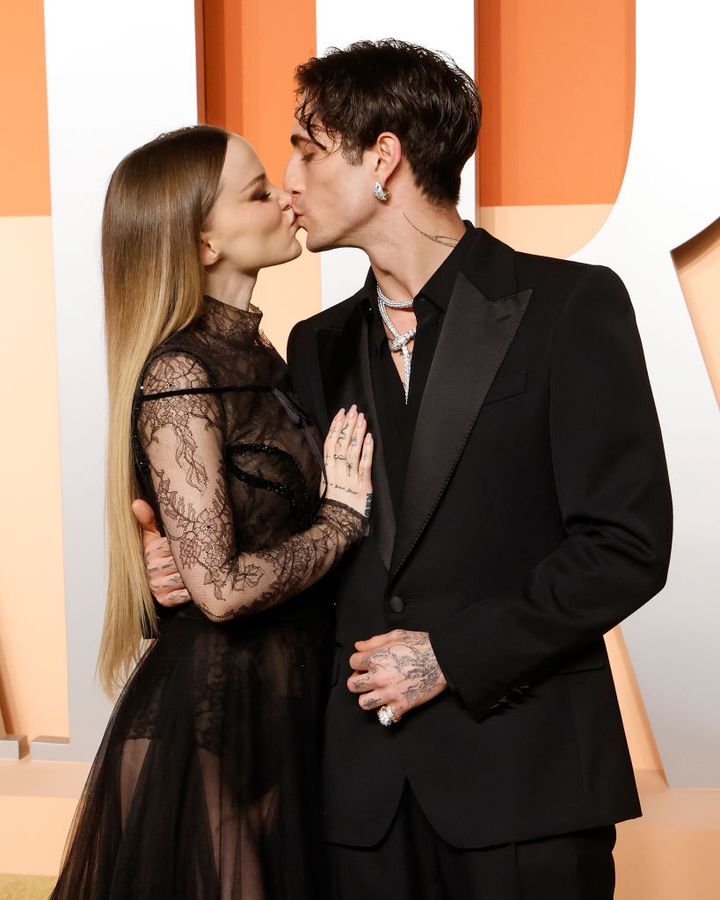 BEVERLY HILLS, CALIFORNIA – MARCH 02: Dove Cameron and Damiano David attend the 2025 Vanity Fair Oscar Party hosted by Radhika Jones at Wallis Annenberg Center for the Performing Arts on March 02, 2025 in Beverly Hills, California. (Photo by Taylor Hill/FilmMagic)