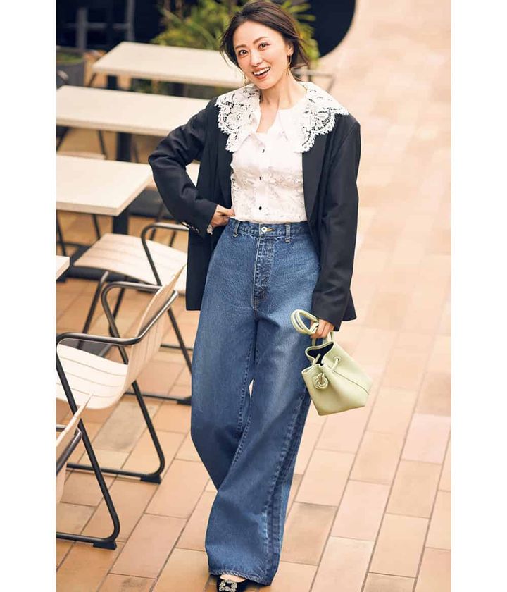 話題を摑めるトレンドアイテムをしっかり詰め込んだ自信の持てるスタイル。デニムコーデも一気に華やぎ大人カジュアルが格上に。