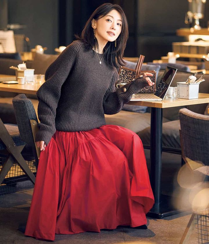 特別感を纏えるスカートで仕事もはかどりご機嫌に。インパクト大の赤スカートも落ち着いたブラウン合わせで品よく今っぽく。