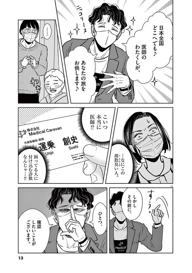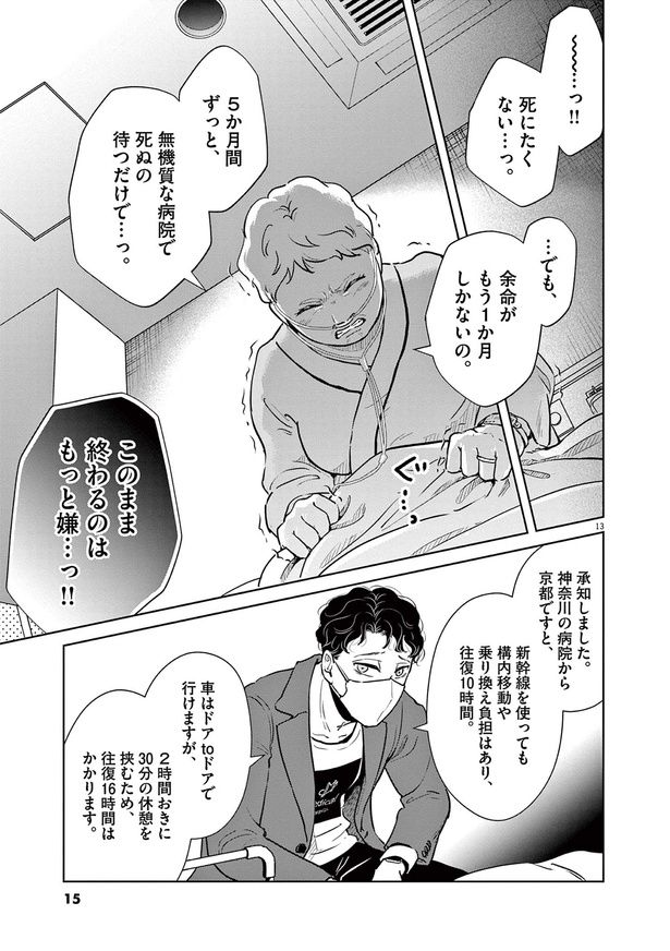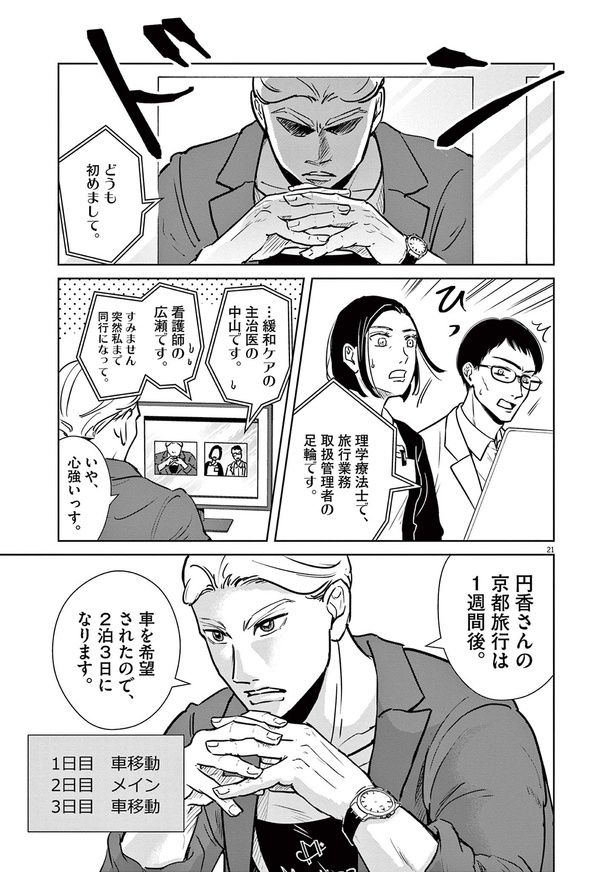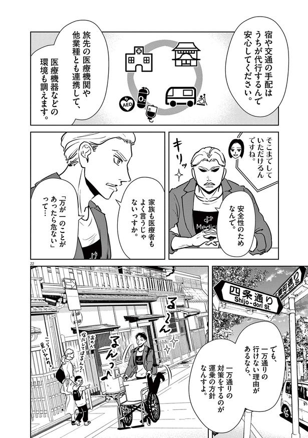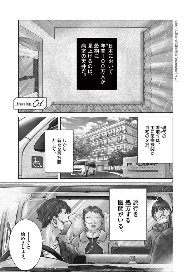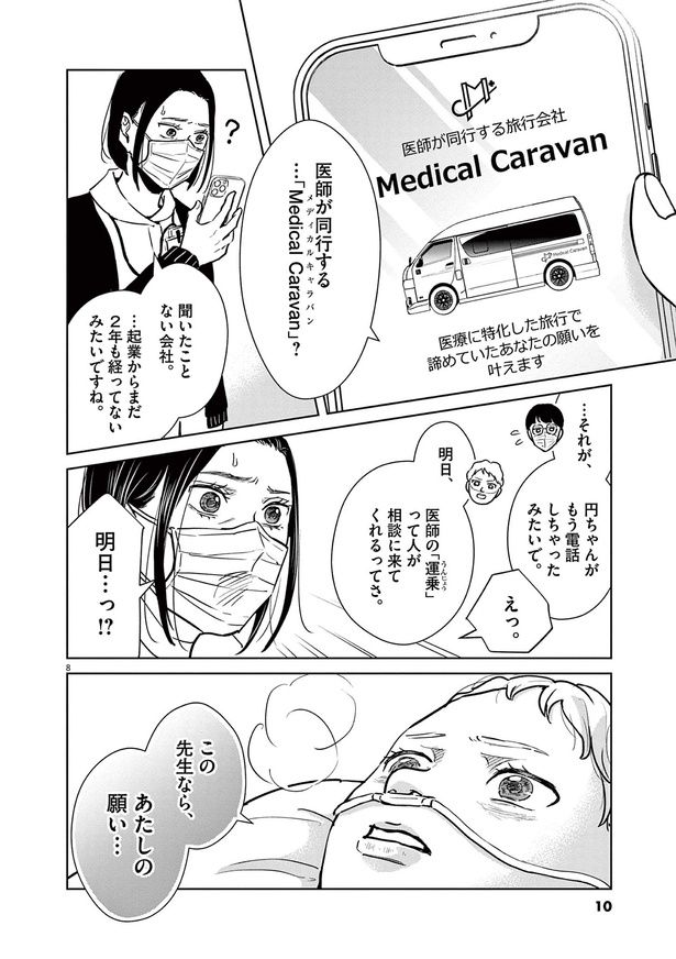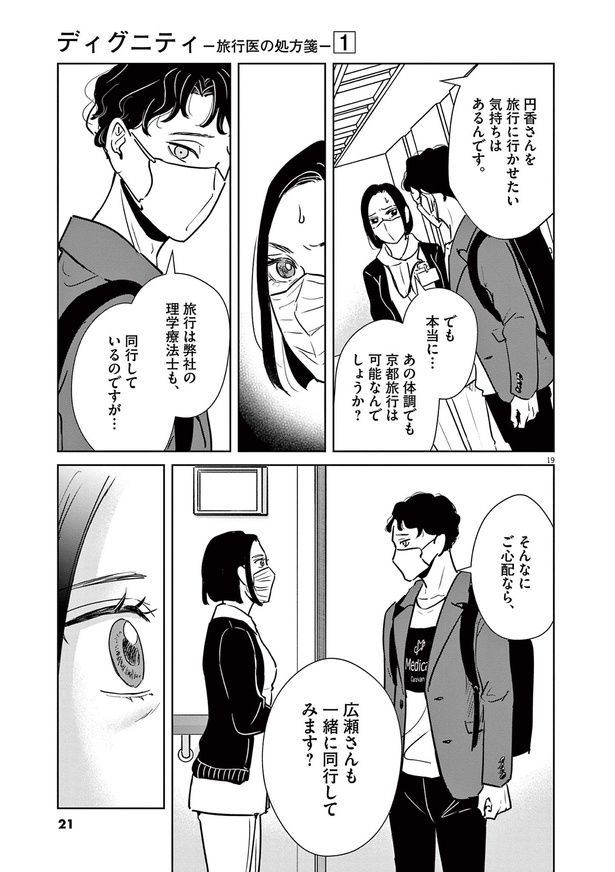 日本において年間100万人が病室で亡くなると言われる現代。看取りの選択肢として終末期患者に旅行を提供する、旅行医の存在をご存知だろうか? 医師が同行する旅行会社「Medical Caravan」を起業&運営する運乗創史もその1人。胡散臭く赤字経営でも、命を懸ける患者のため、彼らは医療に特化した最善の旅行を提供すべく奮闘する――。旅行医監修のもと描かれる医療マンガ『ディグニティ -旅行医の処方箋-』をお届けします。