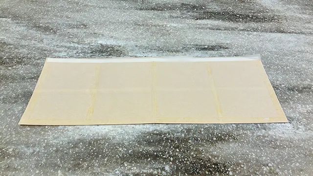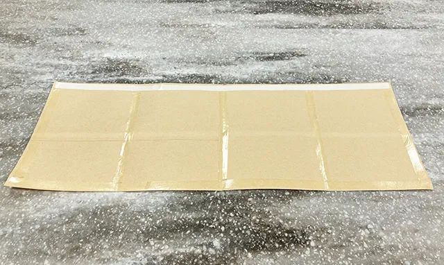 外側と折り目に両面テープを貼ったら、上の辺を除いて、フィルムを剥がします。
