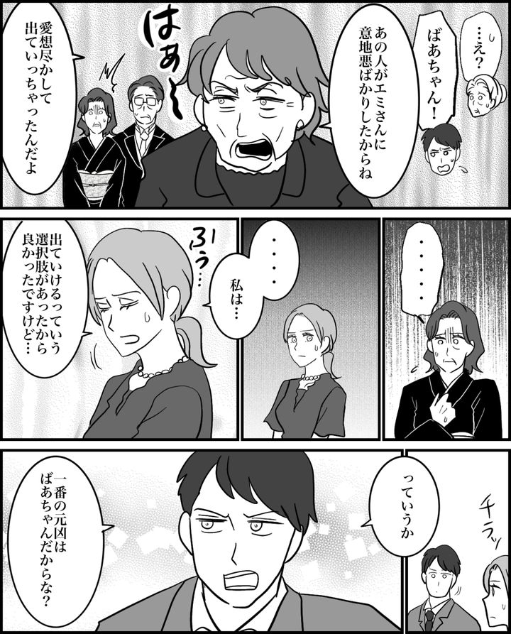 義祖母は親戚に向かって、義母が嫁である私に意地悪ばかりするから出ていかれたと吐き捨てました。私にしてみれば「あなたがそれを言う!?」といったところです。私には同居解消の道がありましたが、義母には逃げ場はなかったでしょう。