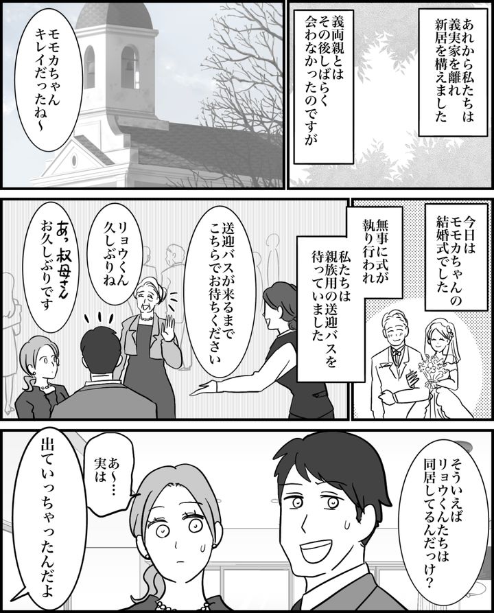 私(エミ)は、夫のリョウと結婚し、義実家で同居していました。しかし義祖母から嫁いびりをされてきた義母は、私とは良好な関係を築きたいと言いながら、義祖母にされてきたのと同じような意地悪を私にするようになりました。まさにダブルスタンダードです。そしてリョウの妹・モモカちゃんの結婚にあたって、義母は自己中心的な主張を炸裂させました。私は次々と矛盾を指摘し、自身の「ダブスタ」に気づいてもらった上で同居を解消したのです。